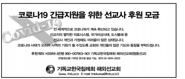코로나19 선교사 긴급지원을 위한 모금 안내 페이지 정보 작성자 fmbkorea 댓글 0건 조회 2,953회 작성일 20-05-12 10:57 목록 본문 코로나19 선교사 긴급지원을 위한 모금 안내 목록 이전글 우즈벡 MK 학교 교사 모집 20.05.18 다음글 Grace International School 소개 20.05.04 댓글 0 댓글목록 등록된 댓글이 없습니다.