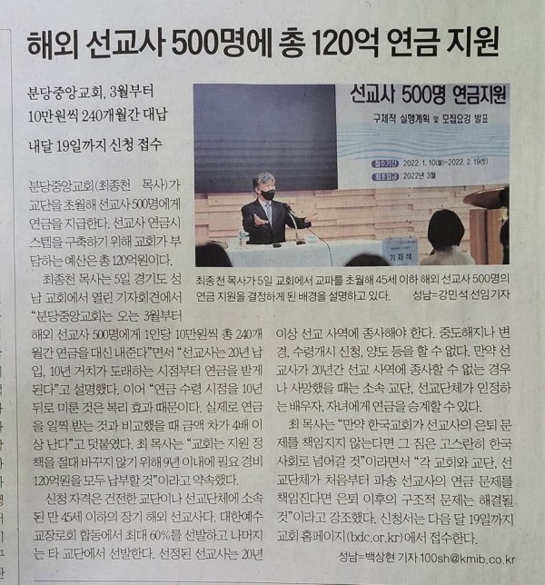 분당중앙교회에서 해외선교사 500명에게 지원합니다.
