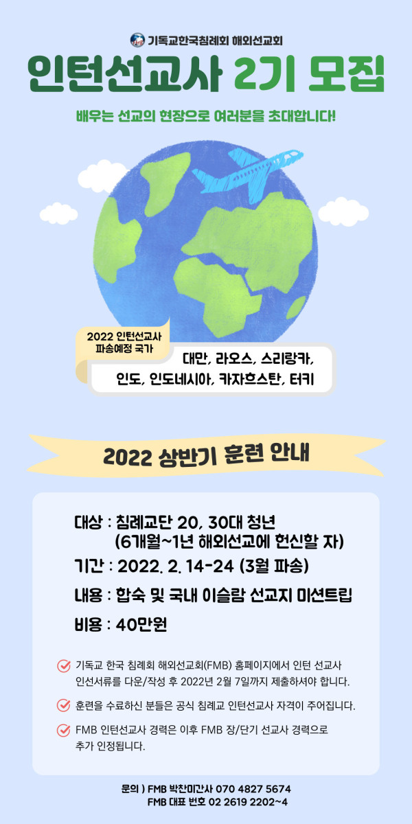 * 홈페이지에서 [선교정보 - 선교사 인선서류 - 인턴선교사 인선서류]를 다운받아 작성하신 후 2022년 2월 7일까지