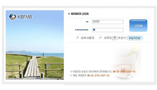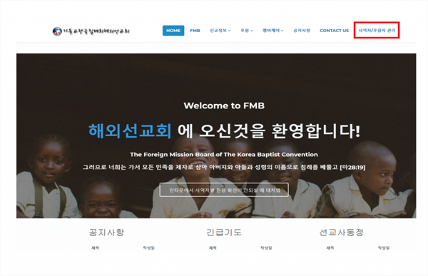 1)www.fmb.or.kr 접속 – 화면 상단 오른쪽 ‘사역자 후원자 관리메뉴’ 클릭